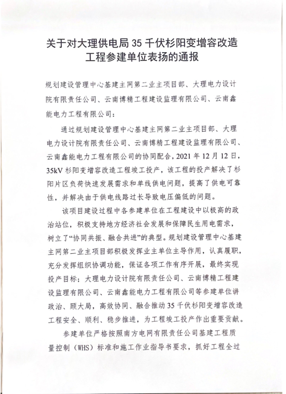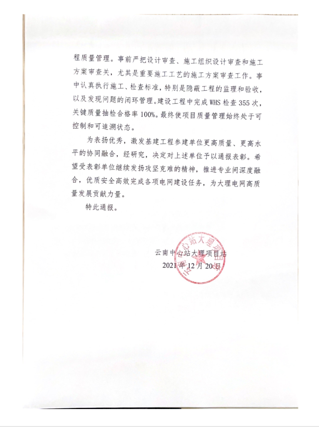 本項目順利投運(yùn),云南中心站大理項目站發(fā)文對各參建單位(規(guī)劃建設(shè)管理中心基建主網(wǎng)第二業(yè)主項目部、大理電力設(shè)計院有限公司、云南博精工程建設(shè)監(jiān)理有限公司及我公司)進(jìn)行了通報表揚(yáng)。